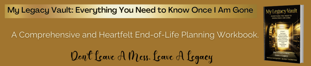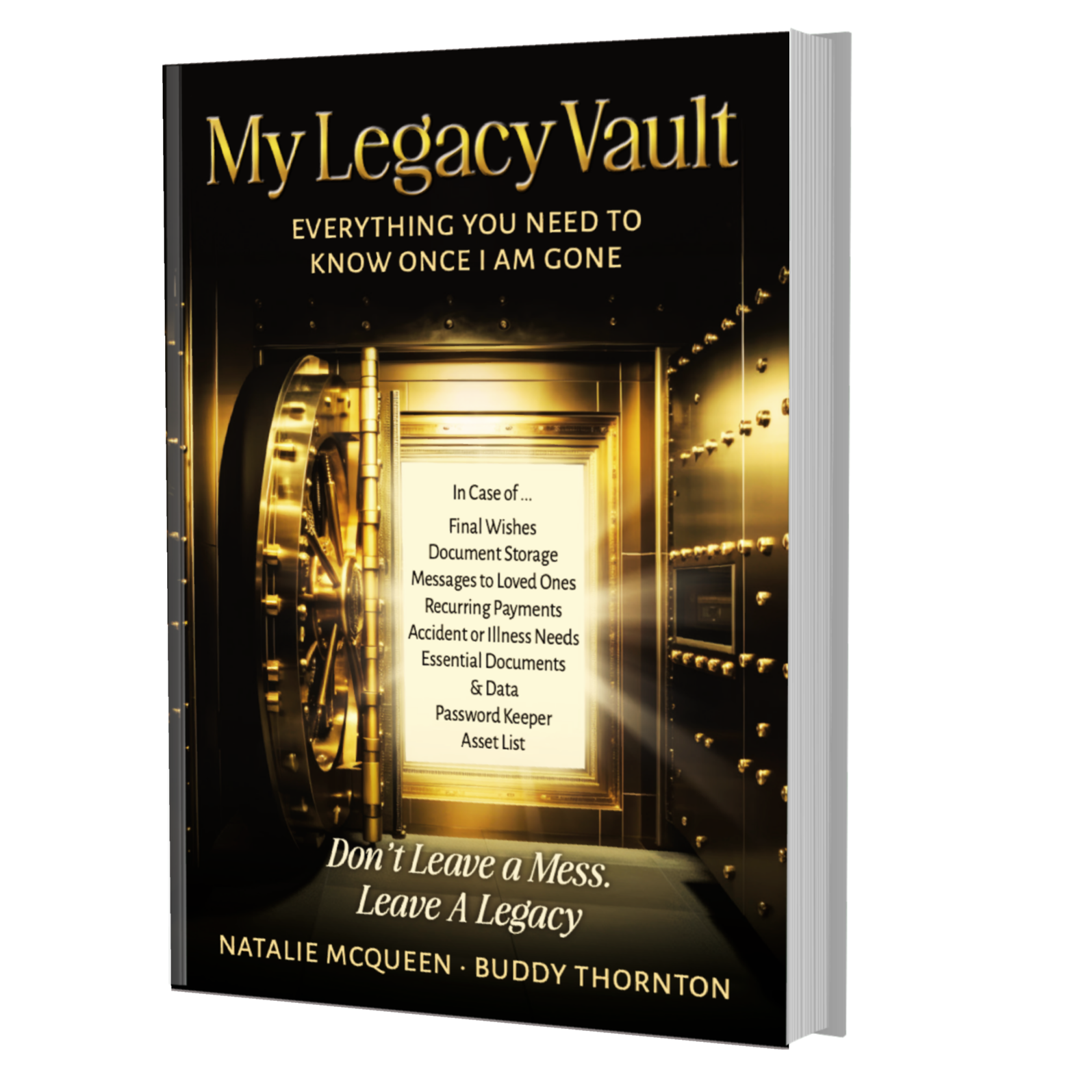 That’s why we’re thrilled to introduce “My Legacy Vault: Everything You Need To Know Once I Am Gone,” a comprehensive and heartfelt end-of-life planning workbook crafted with the essence of creating a lasting legacy. As the founder of Gifts of Legacy, Natalie McQueen brings her passion for preserving heartfelt messages and empowering individuals to curate their life stories. Alongside her is Buddy Thornton, Senior Mediator, and Prosocial Agent, who brings a well-grounded approach to capturing your legacy in this book.